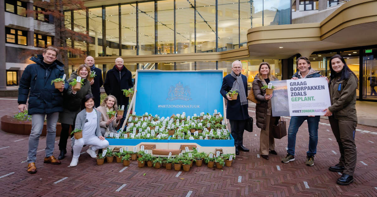 Vertegenwoordigers van de 90 organisaties achter #nietzondernatuur, waaronder Annie van de Pas van de Natuur en Milieufederaties, delen planten uit aan Ministers Van der Wal en Adema.