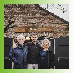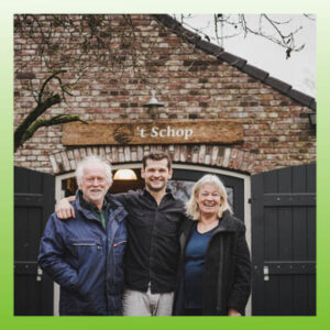 Bioboerderij ’t Schop is een begrip in en rondom Hilvarenbeek. Bijna een eeuw geleden bouwde de overgrootvader Van den Broek de boerderij aan de Esbeekseweg. Cécile en Jan van den Broek namen het bedrijf over in de jaren ’80 en ontwikkelden het tot een modern gemengd bedrijf met zo’n 80 runderen, een hoogstam boomgaard en een grote moestuin, op biologische principes.