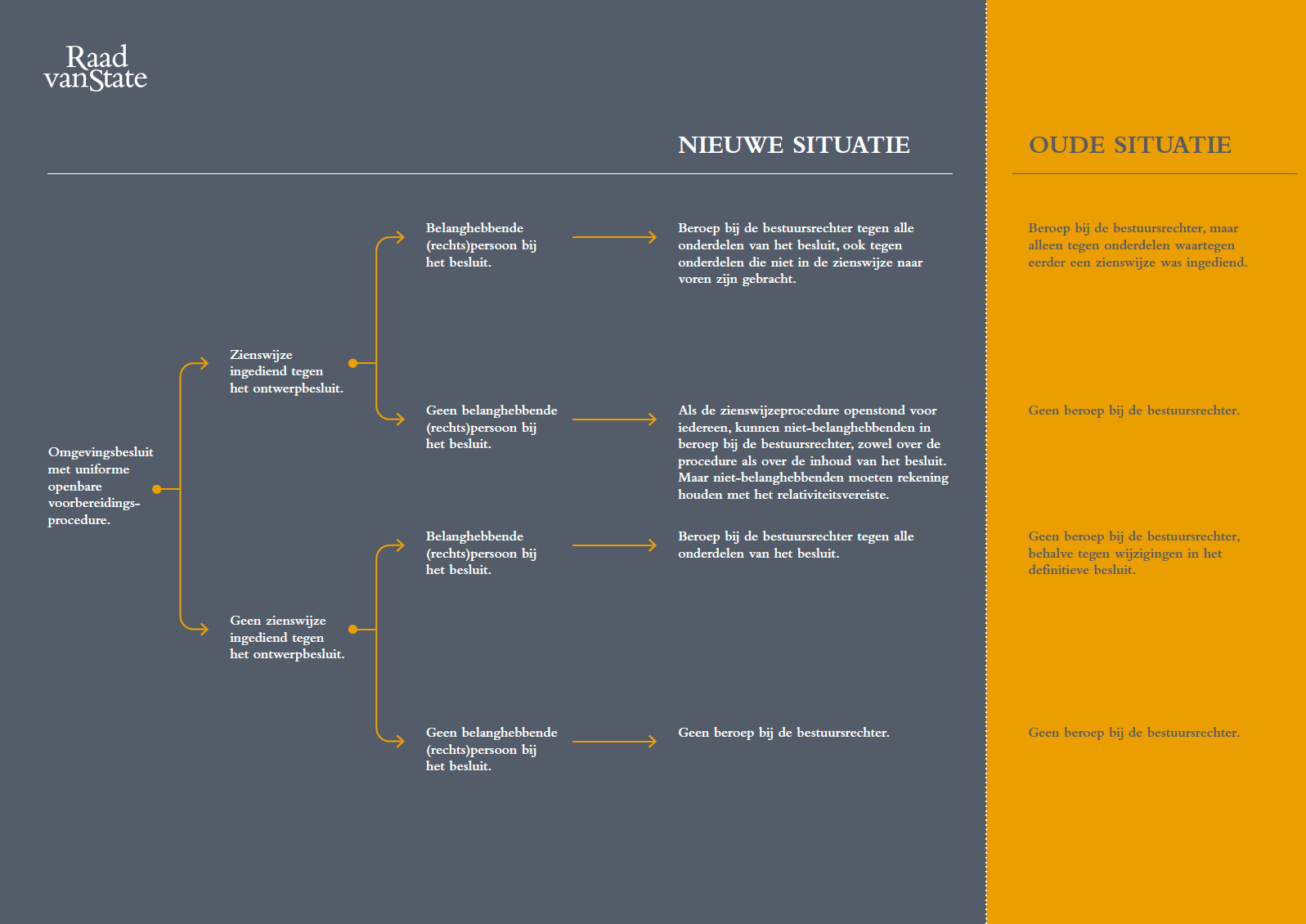 De uitspraken van de Raad van State leiden tot een nieuwe situatie in de toegang tot de bestuursrechter bij omgevingsbesluiten. Die nieuwe situatie is op hoofdlijnen in beeld gebracht in onderstaand schema.