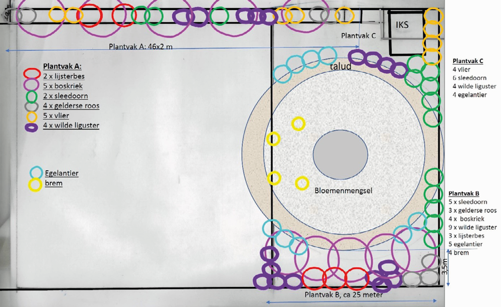 In 2021 is er begonnen met de aanplant van inheemse planten: hoogstam notenbomen (zoals walnoot, kastanje en pecannoot), laagstam fruitbomen (zoals peer, pruim en appel), verschillende soorten bessenstruiken en een meerjarig bijen- en vlindermengsel. Ook zijn er insectenhotels, nestkastjes en een bijenhotel geplaatst.