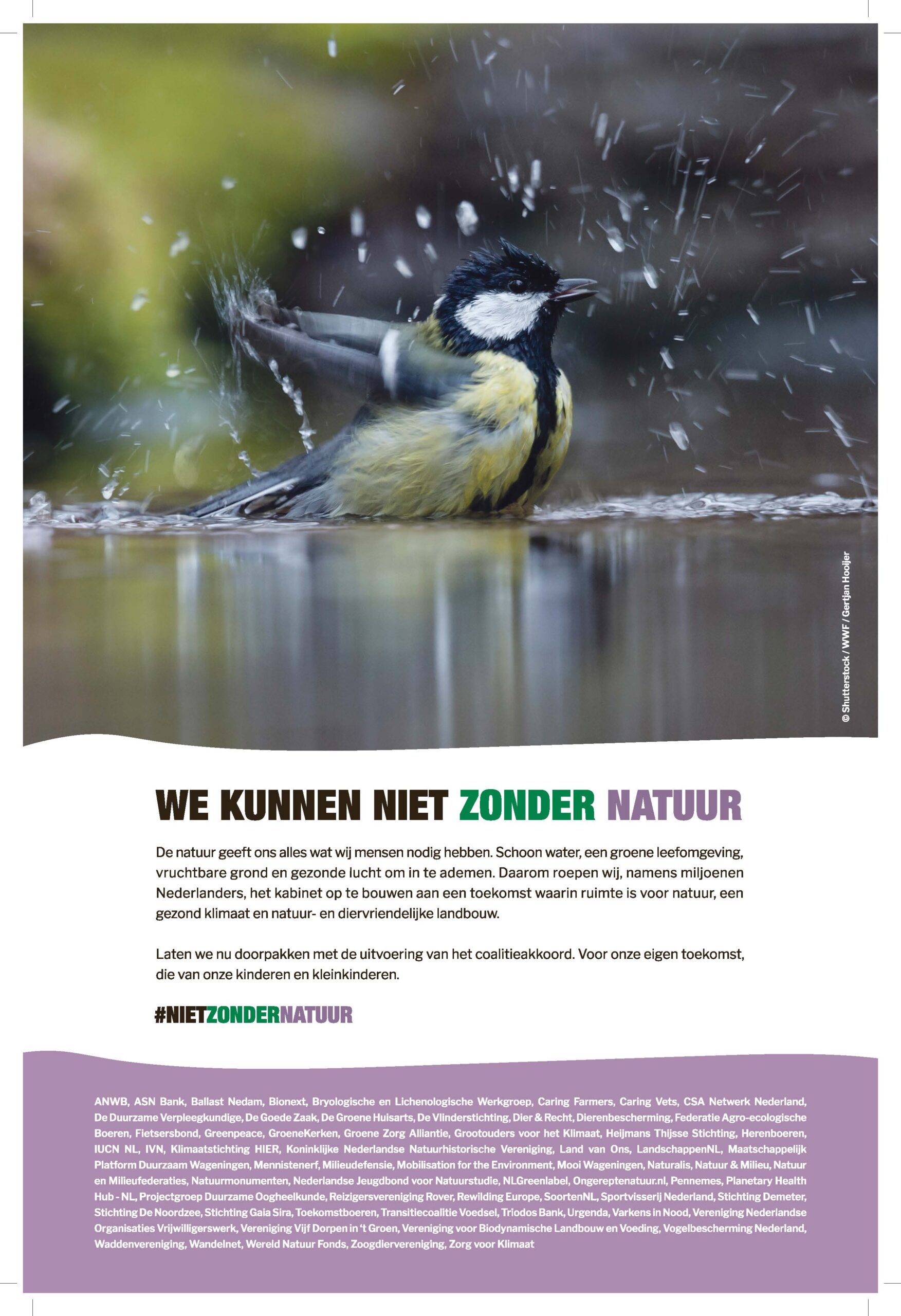 De 64 organisaties ANWB, ASN Bank, Ballast Nedam, Bionext, Bryologische en Lichenologische Werkgroep, Caring Farmers, Caring Vets, CSA Netwerk Nederland, De Duurzame Verpleegkundige, De Goede Zaak, De Groene Huisarts, De Vlinderstichting, Dier & Recht, Dierenbescherming, Federatie Agro-ecologische Boeren, Fietsersbond, Greenpeace, GroeneKerken, Groene Zorg Alliantie, Grootouders voor het Klimaat, Heijmans Thijsse Stichting, Herenboeren, IUCN NL, IVN, Klimaatstichting HIER, Koninklijke Nederlandse Natuurhistorische Vereniging, Land van Ons, LandschappenNL, Maatschappelijk Platform Duurzaam Wageningen, Mennistenerf, Milieudefensie, Mobilisation for the Environment, Mooi Wageningen, Naturalis, Natuur & Milieu, Natuur en Milieufederaties, Natuurmonumenten, Nederlandse Jeugdbond voor Natuurstudie, NLGreenlabel, Ongereptenatuur.nl, Pennemes, Planetary Health Hub – NL, Projectgroep Duurzame Oogheelkunde, Reizigersvereniging Rover, Rewilding Europe, SoortenNL, Sportvisserij Nederland, Stichting Demeter, Stichting De Noordzee, Stichting Gaia Sira, Toekomstboeren, Transitiecoalitie Voedsel, Triodos Bank, Urgenda, Varkens in Nood, Vereniging Nederlandse Organisaties Vrijwilligerswerk, Vereniging Vijf Dorpen in ’t Groen, Vereniging voor Biodynamische Landbouw en Voeding, Vogelbescherming Nederland, Waddenvereniging, Wandelnet, Wereld Natuur Fonds, Zoogdiervereniging, Zorg voor Klimaat. pleiten voor een Nederland waarin ruimte is voor natuur, een gezond klimaat en natuurvriendelijke landbouw. Het is nu aan het kabinet om aan de slag te gaan met de uitvoering van het coalitieakkoord.