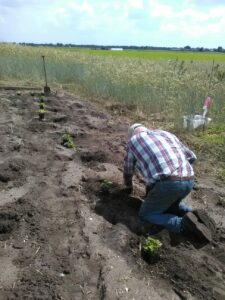 In het voorjaar van 2018 is een groep mensen aardbeien gaan planten. Eerst werd de grond voorbewerkt door het los te woelen met cultivator. Er was al in de winter wat oude stalmest door de grond gewerkt om de grond luchtiger te maken. De structuur van de grond bleek echter nog steeds erg slecht door het voormalige intensieve gebruik van de grond.