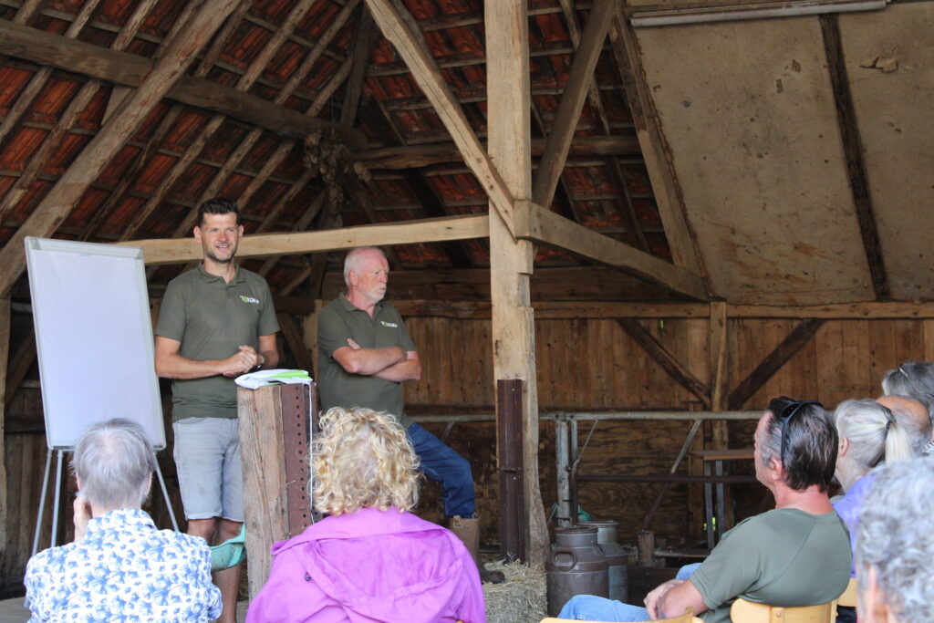 Jan en Bart ontvingen ons met een heerlijk kopje koffie of thee en startten ons bezoek in de kapschuur waar een aantal weken geleden nog koeien op een dikke laag stro stonden. Jan vertelde met verve over hoe het zover gekomen is op ’t Schop. Eerst over het gemengde bedrijf van opa Van den Broek in 1923, die superzuinig met zijn mest omsprong. Daarna over zijn vader, die meeging met zijn tijd met trekkers, melkmachines, kunstmest en de rol die de ruilverkaveling daarin speelde.