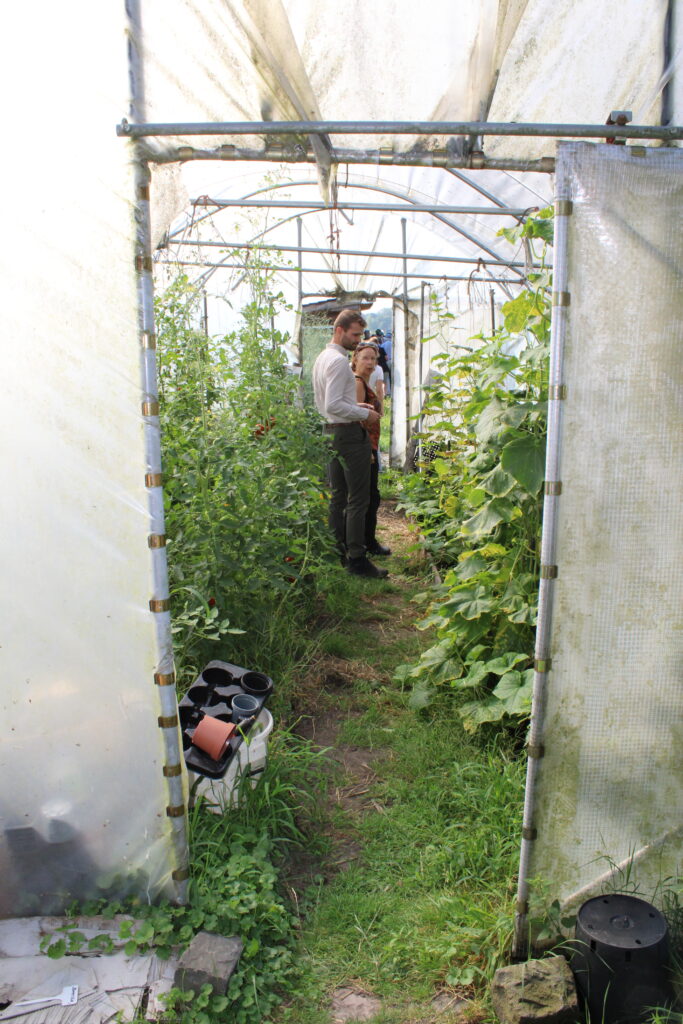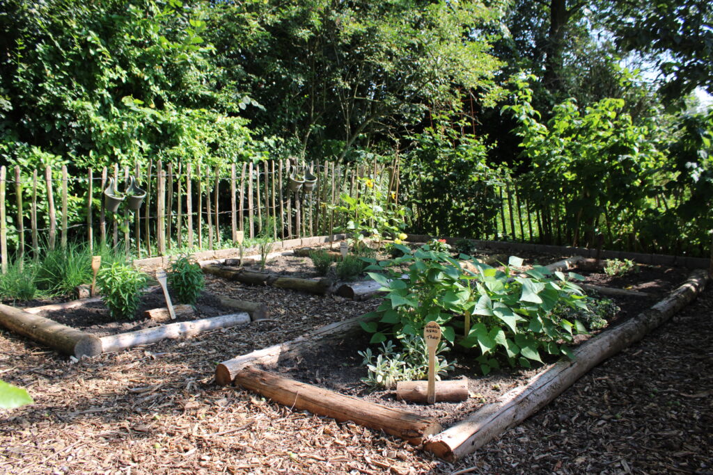 Inmiddels is het de hoogste tijd om de kapschuur uit te komen en met Jan het erf op te gaan. Het is prachtig weer en in het zonnetje maken we een rondgang. We beginnen bij de kruidentuin en de moestuin en staan langer stil bij de compostkeuken. Hier benadrukt Jan het belang van het bodemleven. Biologische boeren gebruiken geen kunstmest en geen bestrijdingsmiddelen, omdat dat funest is voor het bodemleven. In plaats daarvan kun je de bacteriën en ander leven in de bodem juist voeden met compost en stalmest.