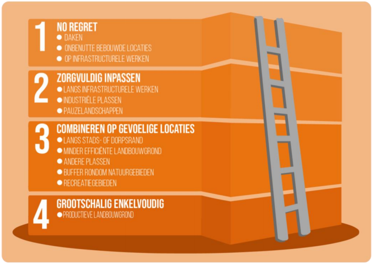 De Constructieve Zonneladder is een handreiking die gemeenten kunnen hanteren om in 5 stappen hun eigen, lokale zonne-energie beleid te vormen. De ontwikkeling van zonne-energieprojecten wordt op deze manier in goede banen geleid, door zonnepanelen op voorkeurslocaties te stimuleren en door duidelijke voorwaarden te stellen.