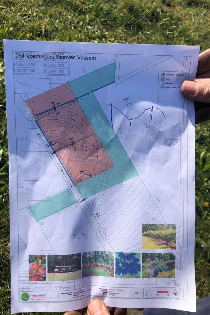 Sjef van Dongen van Fruits for Life heeft voor deze 1 ha het ontwerp en plantkeuze gemaakt. Dat heeft geleid tot een aanplant in ronde bogen met 5 meter ruimte ertussen. De eerste jaren kan nog gemaaid worden (gras/witte klaver), maar geleidelijk aan gaan de rijen dichtgroeien.