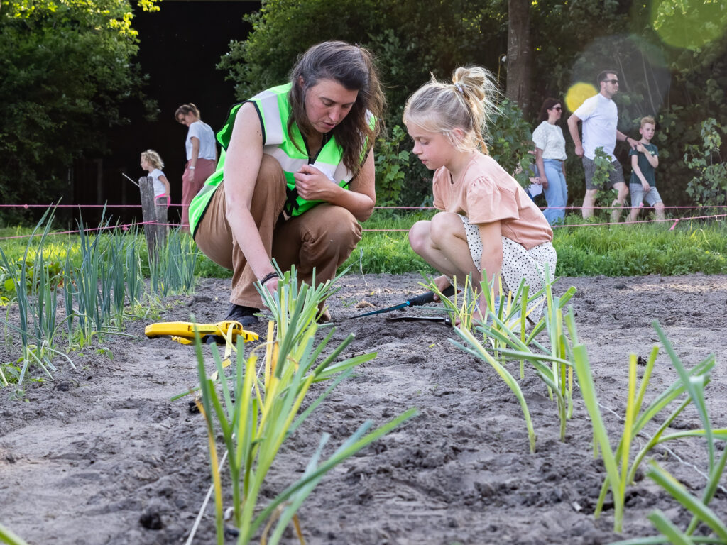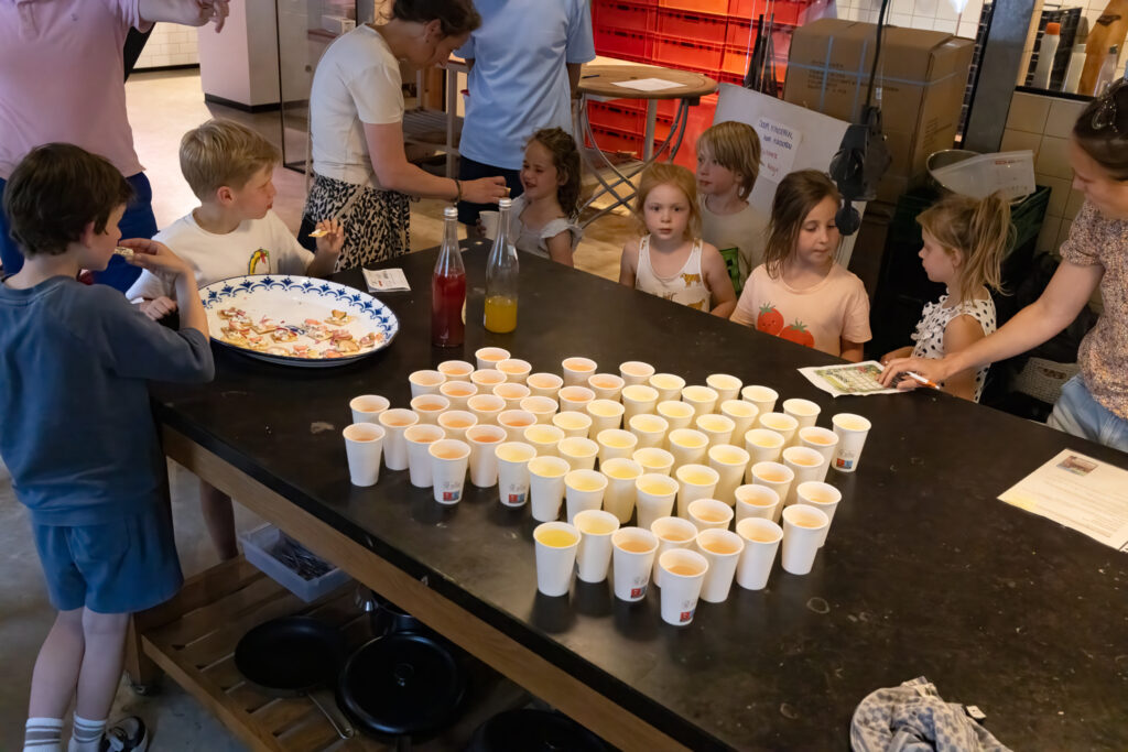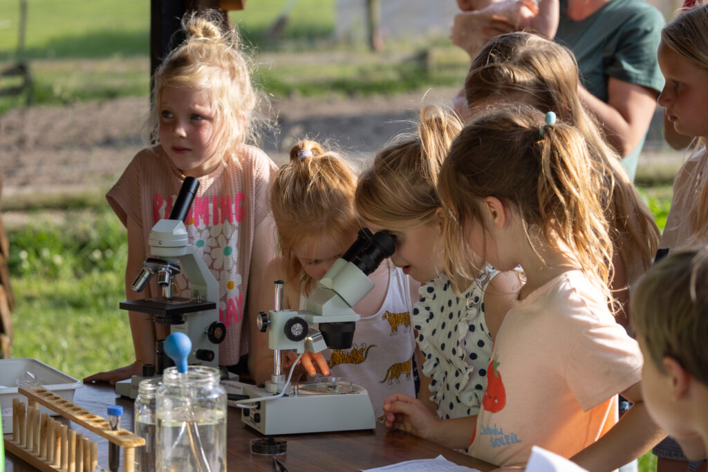 Beestjes zoeken in de wei met een loeppotje en een zoekkaart, groenten leren herkennen in de moestuin, bodemleven onderzoeken onder de microscoop en natuurlijk proeven! In de moestuin plukten de kinderen zelf van de bessenstruiken en in de keuken kregen ze drinken van door leerlingen gemaakte siropen van vlierbessen en rabarber, met een hapje erbij. Enthousiast liepen en renden de kinderen langs acht verschillende activiteiten en lieten ze hun ouders zien waar ze tijdens hun moestuinlessen op donderdagochtenden aan de slag zijn.