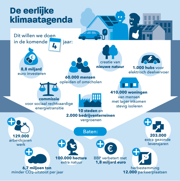 De Eerlijke Klimaatagenda zorgt voor bijna 130 duizend arbeidsjaren werk en jaarlijks bijna 7 miljoen ton minder CO2-uitstoot (gelijk aan de CO2-uitstoot van het wegverkeer). Daarnaast verbetert het de gezondheid van mensen met opgeteld 203 duizend gezonde levensjaren.