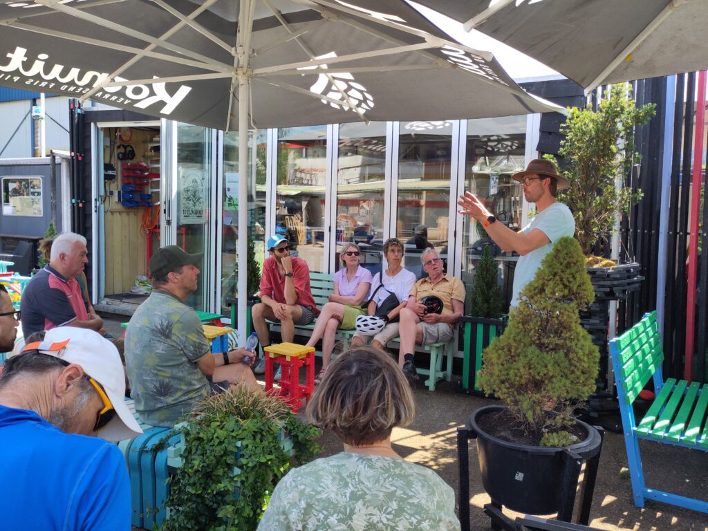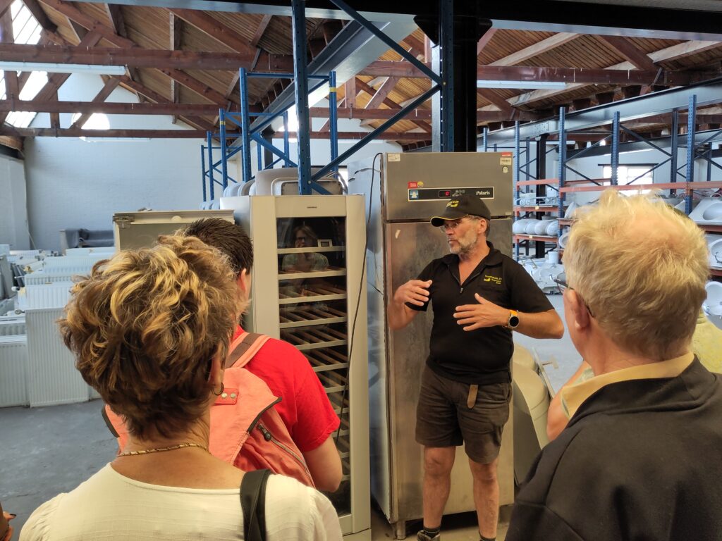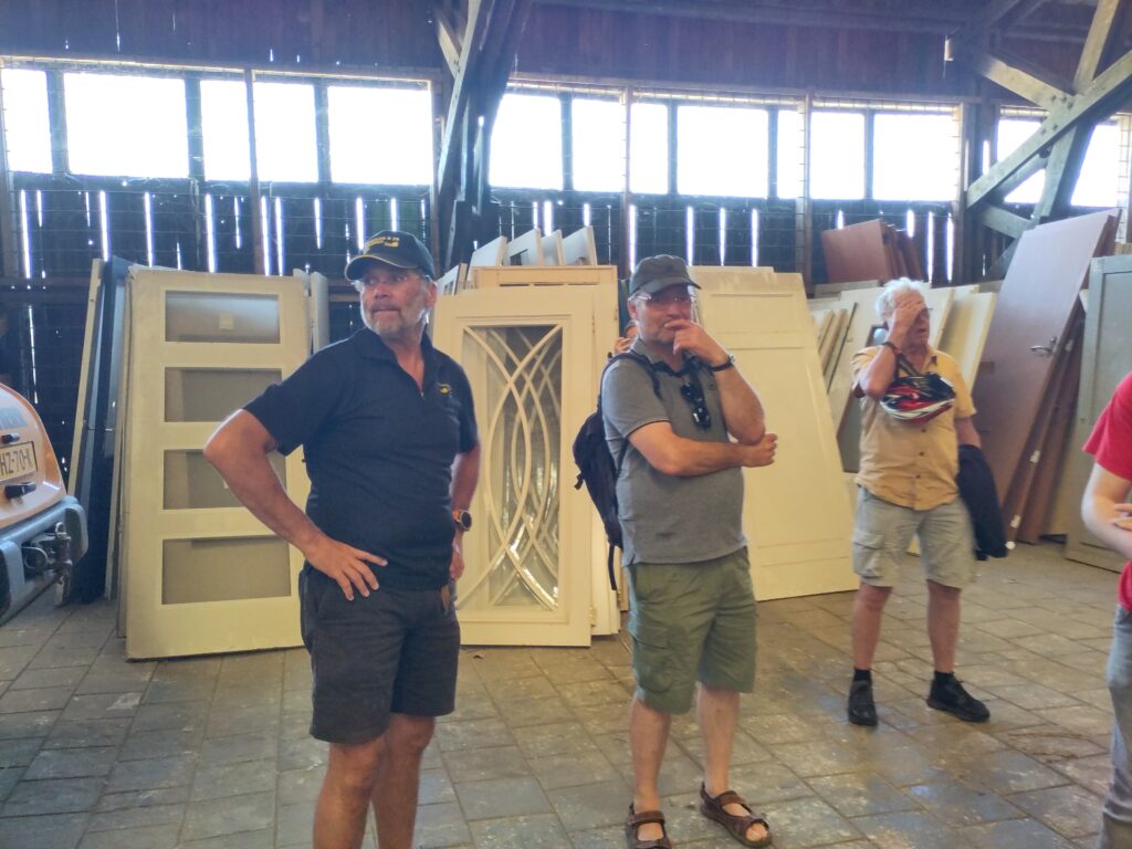 Bij de eerste halte ging het over hergebruik van bouwmaterialen. Patrick Vermeulen van Vermeulen Sloopwerken vertelde over de uitdagingen van circulair slopen. Hij gaf een rondleiding langs de vele deuren, wasbakken, houten balken en ijzeren hekken die hij een tweede leven hoopt te geven. Materialen die iedereen weleens in containers ziet liggen en waarbij je je afvraagt of dat niet hergebruikt kan worden. “Dat kan!” was het goede nieuws van Patrick, maar het blijkt niet zo simpel als het lijkt. De toelichting die Patrick gaf op kwaliteitseisen, opslagruimte en sloopkosten maakte dat wel duidelijk. Nieuwsgierig? Vermeulen Sloopwerken verkoopt ook aan particulieren, dus neem een kijkje op de website voor de openingstijden. Na een verkoelende traktatie ging de tocht verder naar de tweede halte.
