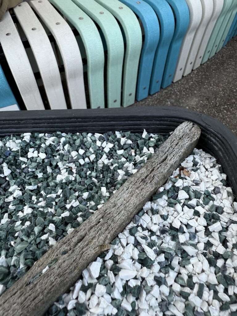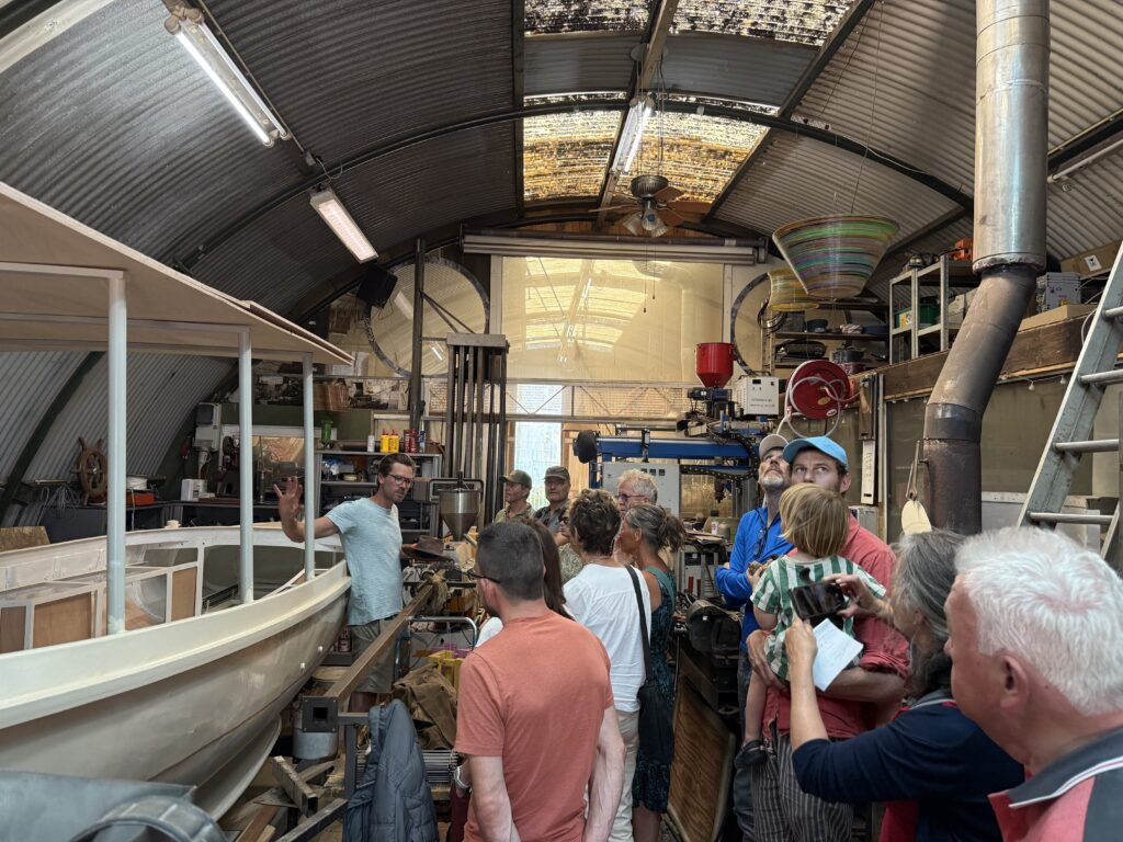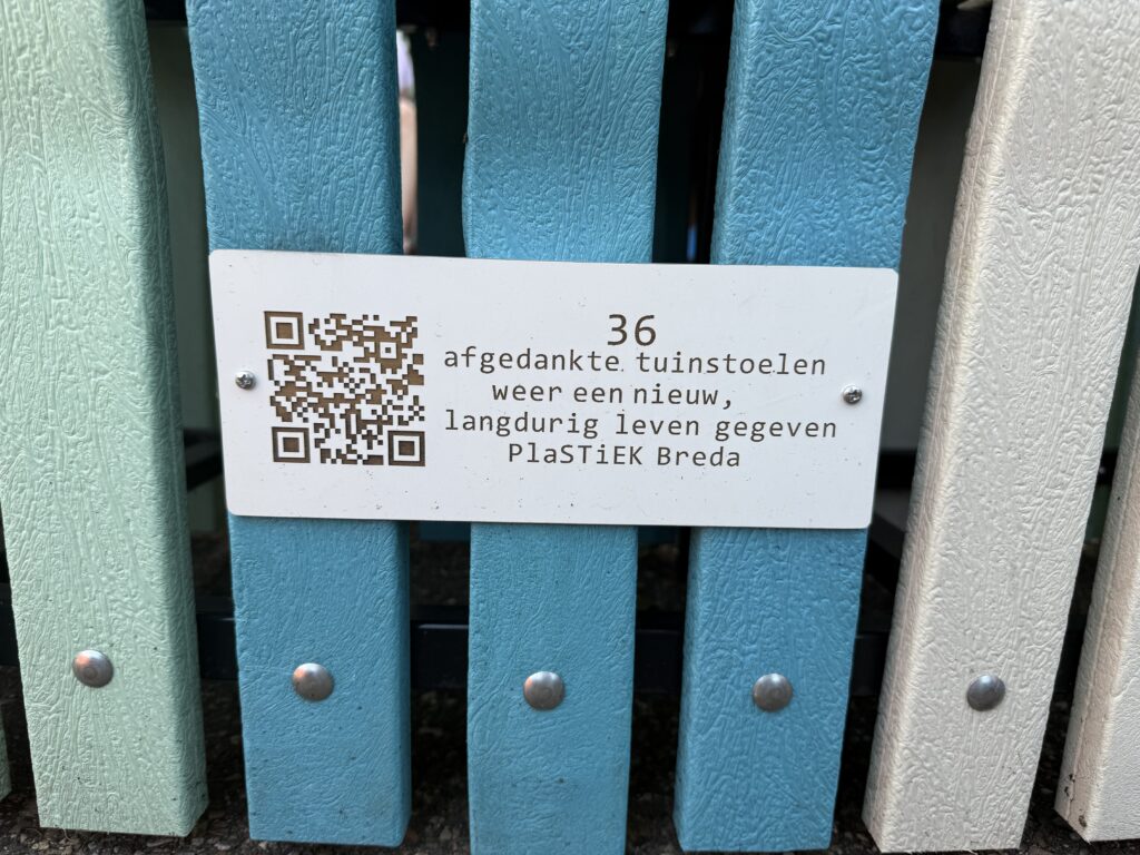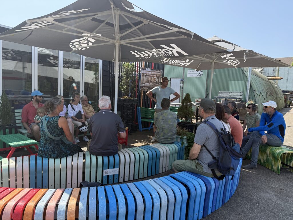 Zo’n 5 fietsminuten later kwam de volgende halte in zicht: PlaST(i)EK, één van de circulaire ondernemers op creatief bedrijventerrein STEK. Daar vertelde Jilles Verschoor hoe hij vanuit het bankwezen overstapte naar de wereld van hergebruik van plastic tuinstoelen. Een pad van zoeken en uitproberen, maar inmiddels slaagt hij erin om het materiaal waar ze uit bestaan (polypropeen, gemaakt van aardolie) lokaal om te zetten naar granulaat waar hij vervolgens kleurrijk en oersterk recyclebaar tuinmeubilair van maakt. Heel bruikbaar, en met een kunstzinnig tintje, zoals de tuinbank in de blauwe en rode kleuren van de klimaatbarcode. Het proces liet Jilles ter plaatse zien.
