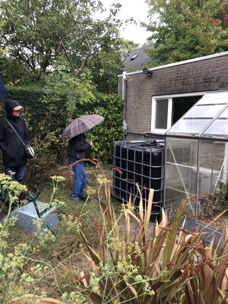 In Oirschot zagen we twee bijzonder biodiverse tuinen met veel aandacht voor wateropvang. In de eerste tuin vielen de waterdoorlatende bestrating en het groene dak op. Daarnaast waren hier veel verschillende regentonnen te zien en was er speciale aandacht voor bloesembogen. Bestuivende insecten zoals bijen vinden hier het hele jaar door iets te eten. De tweede tuin kenmerkte zich door veel afwisseling en biodiversiteit, een bosje, een grote vijver en veel prachtige hoekjes en doorkijkjes.