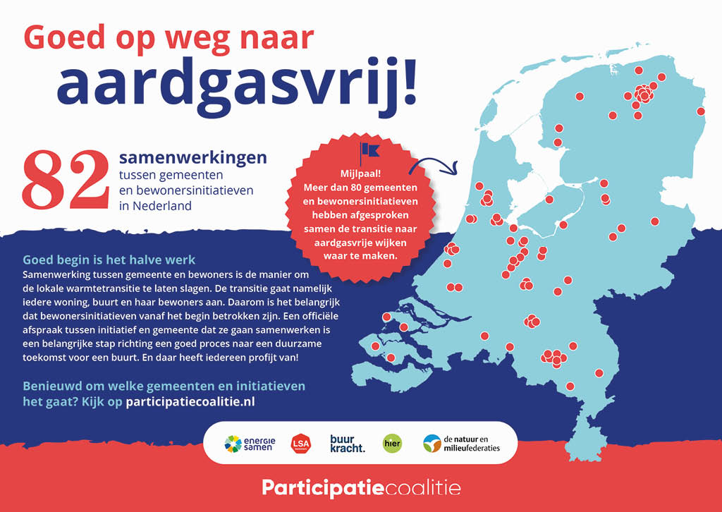Al 82 gemeenten en bewonersinitiatieven hebben afgesproken samen de overgang naar aardgasvrije wijken te maken. Deze samenwerkingen zijn begeleid door de Participatiecoalitie.