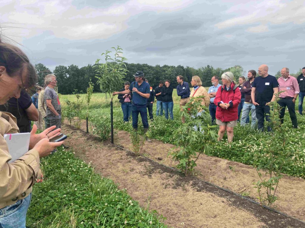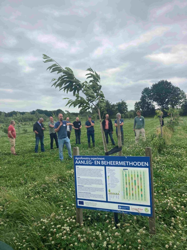 Inmiddels was het hoog tijd om naar buiten te gaan en met eigen ogen te zien hoe zo’n agroforestrysysteem er in de praktijk uitziet. Op de Experimenteerlocatie van Sjef van Dongen kregen de deelnemers uitgebreid tekst en uitleg over allerhande zaken aangaande aanplant, soorten, toepassing en beheer en onderhoud. Ook de overbuurman van Agroforestrysupplies, Gerard Opsteeg, op wiens land een deel van de aanplant van agroforestry is gedaan, was erbij om uitleg te geven.