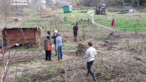 Tijdens de voedselboscursus kregen ze advies van Wouter van Eck, een van de pioniers in Nederland op dit gebied. Hij adviseerde om een jaar de tijd te nemen om de locatie van het voedselbos te observeren, voordat je het gaat ontwerpen en aanleggen. Maar de Transfarmers waren zo enthousiast, dat ze meteen begonnen zijn. Als eerste moest een hoop afval worden opgeruimd. En het gebied staat vol met bramen en brandnetels. Geertje: “Deze planten komen spontaan op als de bodem te veel stikstof bevat. Ze hebben een belangrijke functie om de bodem weer in balans te krijgen. Daarom kiezen wij ervoor om de brandnetels te laten staan. Daarnaast zijn ze belangrijk als waardplant voor vlinders en maken de wortels de grond luchtig. Als de aangeplante bomen eenmaal groot genoeg zijn, zullen de brandnetels vanzelf minder licht krijgen en afsterven. Maar de bramen gaan eruit. Die zijn te sterk en te dominant, het nieuw aangeplante materiaal krijgt anders geen kans. We laten verder staan wat daar goed groeit en willen toevoegen: daslook, bosbessen, rimpelroos, rode en witte aalbessen, kruisbessen en wat fruitboompjes zoals kweepeer, mispel en walnoot.”
