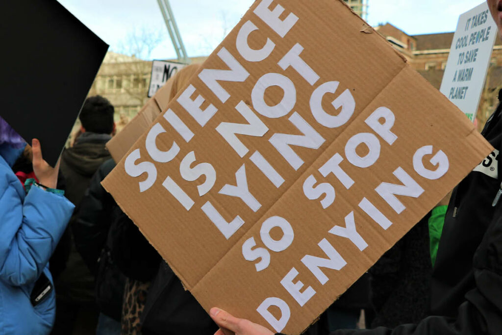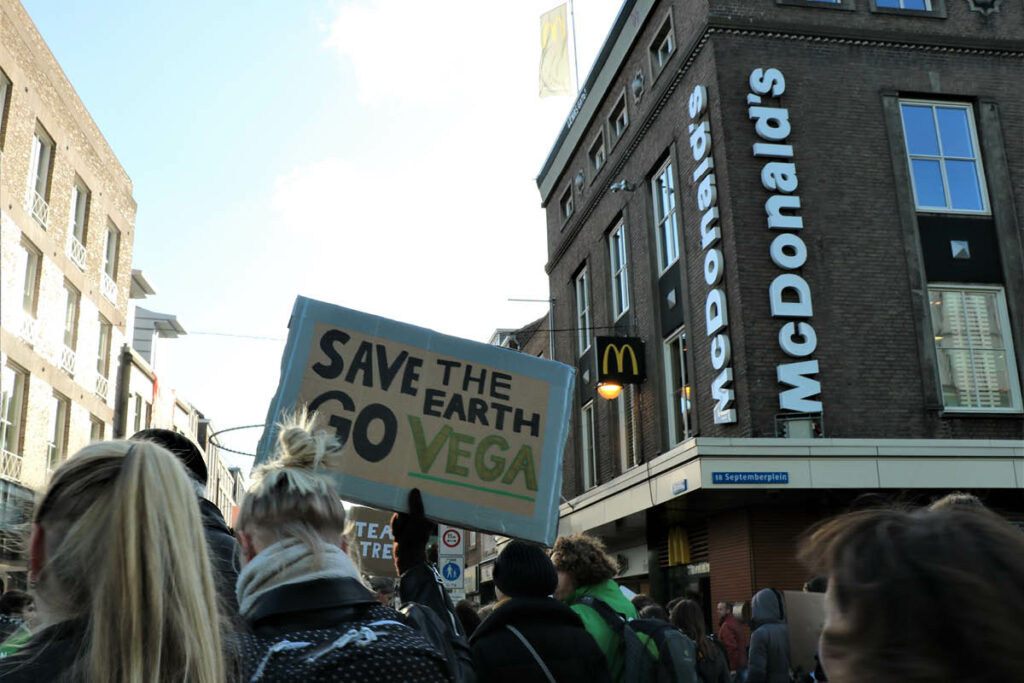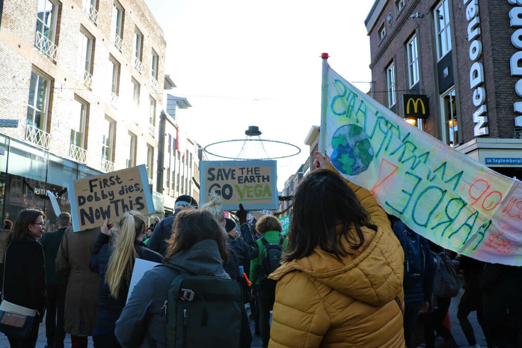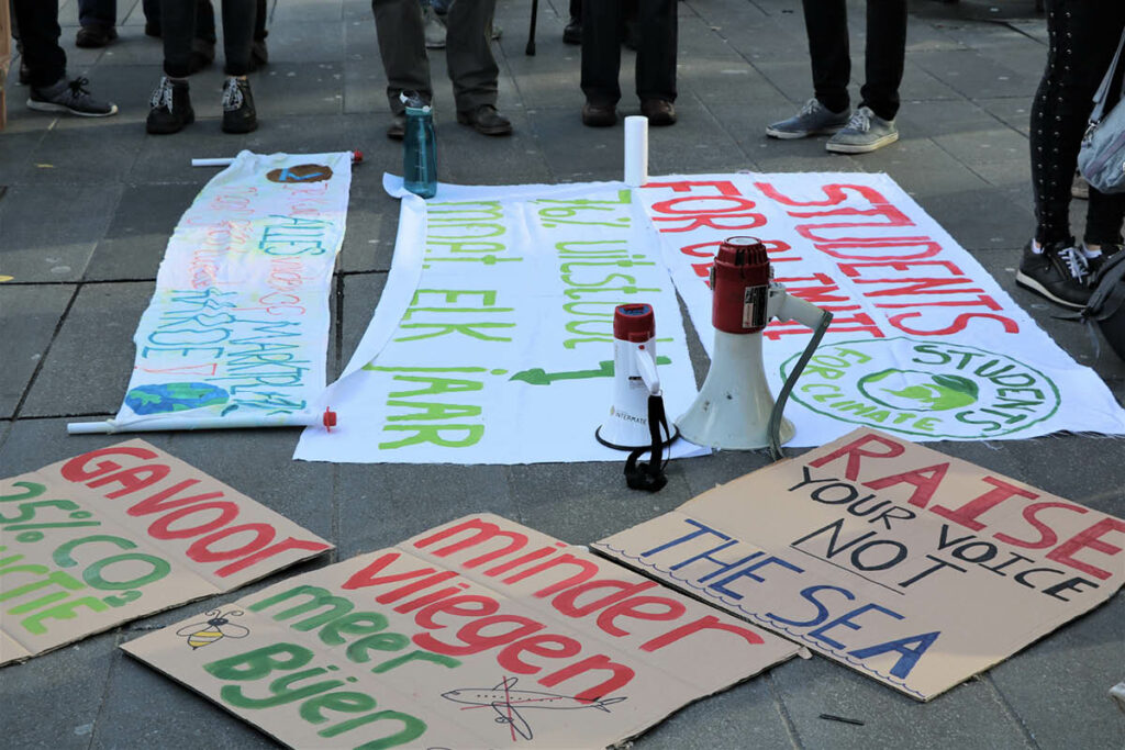Met omhooggehouden spandoeken en kartonnen bordjes lopen de scholieren, studenten en volwassenen door het stadscentrum van Eindhoven. De leus “What do we want? Climate justice! When do we want it? Now!” wordt meerdere keren ingezet door de organisatoren van Students For Climate Eindhoven. De rest roept hard mee.
