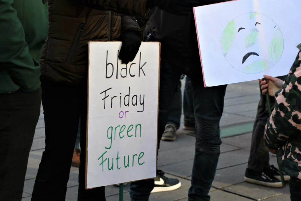 Het centrum is drukbezocht, deze vrijdagmiddag. De Amerikaanse Black Friday heeft zijn intrede gedaan in Nederland. Demonstranten houden hun bordjes met slogans nog hoger in de winkelstraat om het winkelende publiek bewust te maken van deze koopjesdag. ‘Black Friday or Green Future?’ ‘Do you really need it? Think Twice! No to Black Friday!’