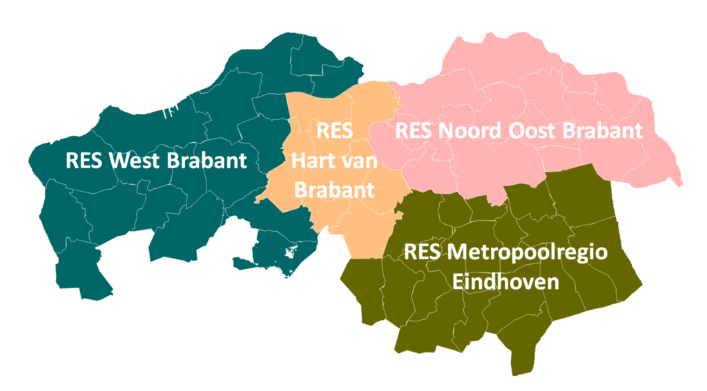 Nederland is verdeeld in 30 RES-regio’s. Vier daarvan liggen in de provincie Noord-Brabant. Het gaat om de Regio West-Brabant, Regio Hart van Brabant, Regio Noord-Oost-Brabant en Metropoolregio Eindhoven.
